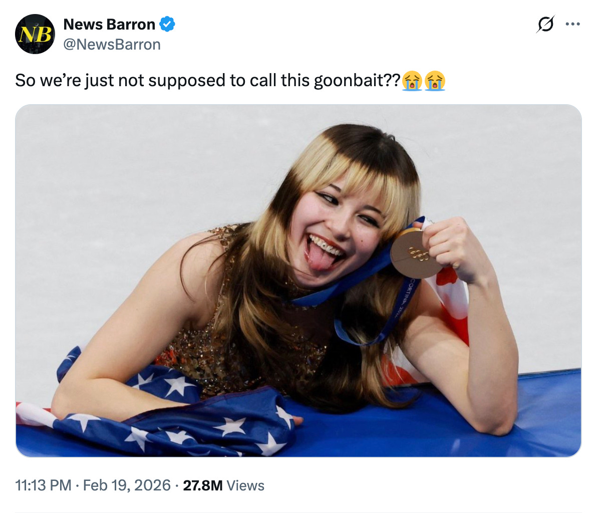 Surely, some new reason for thinking this way emerges almost daily. I am now a bit late on this, but I am nevertheless still thinking about how the Olympics were one such source of this misery, particularly around ice skating gold medalist Alyssa Liu. From the moment she hit the rink, complete freaks and losers saw an opportunity to transform the narrative of a happy and talented young woman into one of voyeuristic depravity. As she posed holding her gold, making a silly face, one person wrote “So we’re just not supposed to call this goonbait?” Their suggestion is that Liu is intentionally trying to appease the chronic masturbators, that she wants them all to jack off to her and is indulging them accordingly.