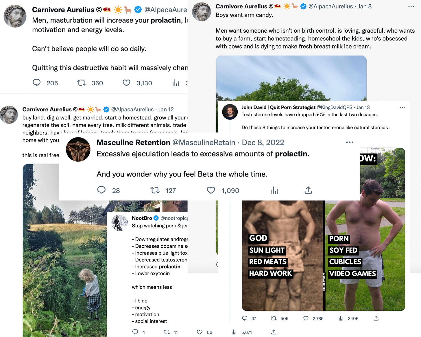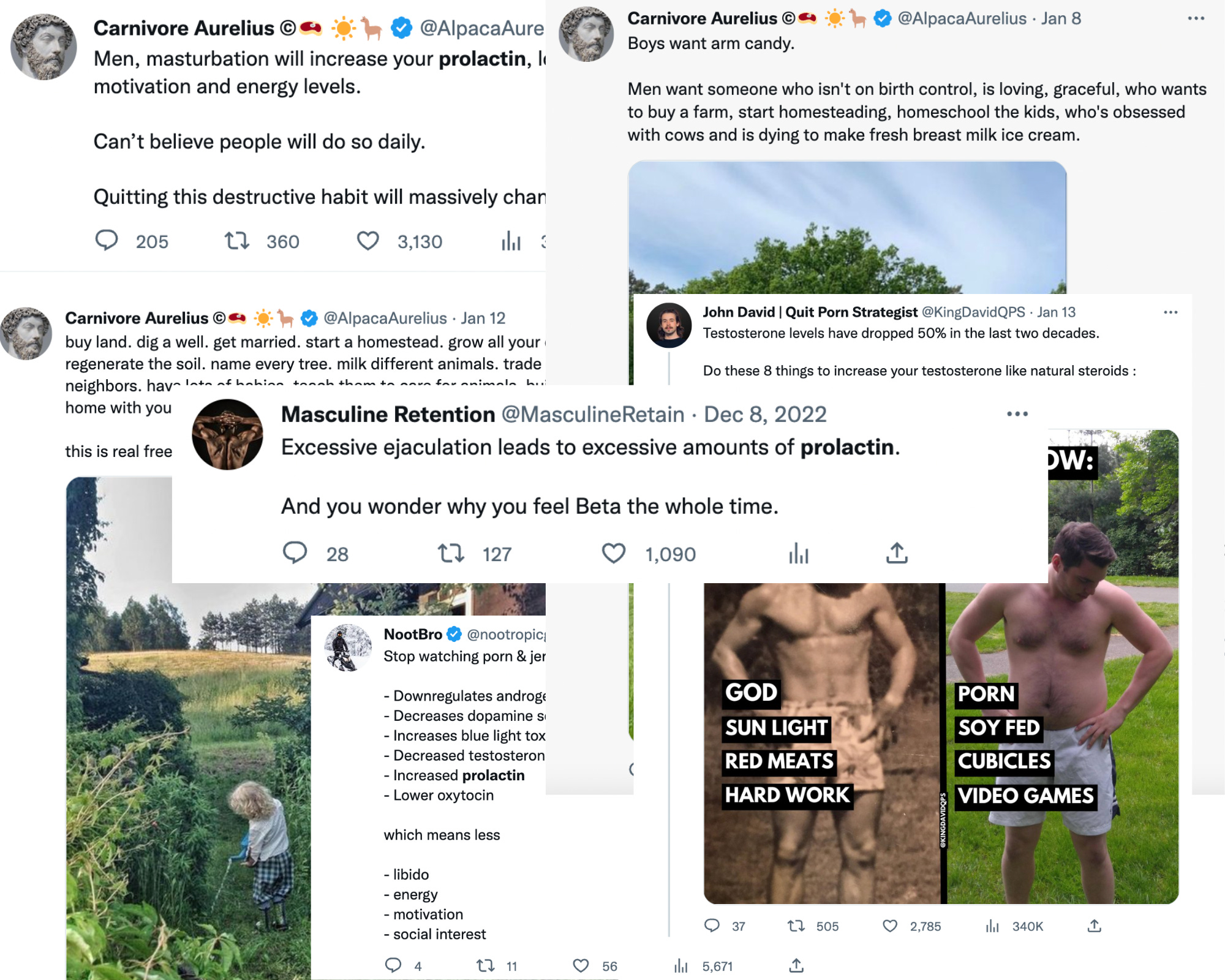 As I discussed in my No Nut November and goon cave pieces, it’s obvious that there are plenty of men for whom porn has become a destructive habit that eats up too much of their time and energy. It’s all fine and good that some people want to change their relationship with porn and masturbation. I personally think more men should give masturbating without porn a try sometimes, and I also think people can be normal with porn in the way people can be normal with alcohol. But again, whatever truth might be found in these tweets about porn and masturbation must be parsed from claims for which there is little evidence. In particular, they keep talking about prolactin. Prolactin is a hormone that is mainly responsible for breast milk production in women, but men produce prolactin, as well — namely, after orgasm. It’s long been thought that prolactin is what causes the refractory period in men after sex, but more recent studies have found that there’s not much evidence for this. There is, however, plenty of research that says that high prolactin levels in men can indeed lower testosterone and reduce libido. It’s this that Carnivore Aurelius and others are leaning on. The thing is, problematically high prolactin levels are probably not the result of orgasm but of an endocrine disorder. If masturbation caused chronically high prolactin levels, so would sex — men produce 400% more prolactin following orgasm during intercourse compared to masturbation. And yet, nobody is decrying sex as ruining testosterone. So my question here is, what are these people after in making claims like this? They’re trying to hook you on some semblance of truth and an insecurity, and they’re doing it to sell you beef liver jerky.