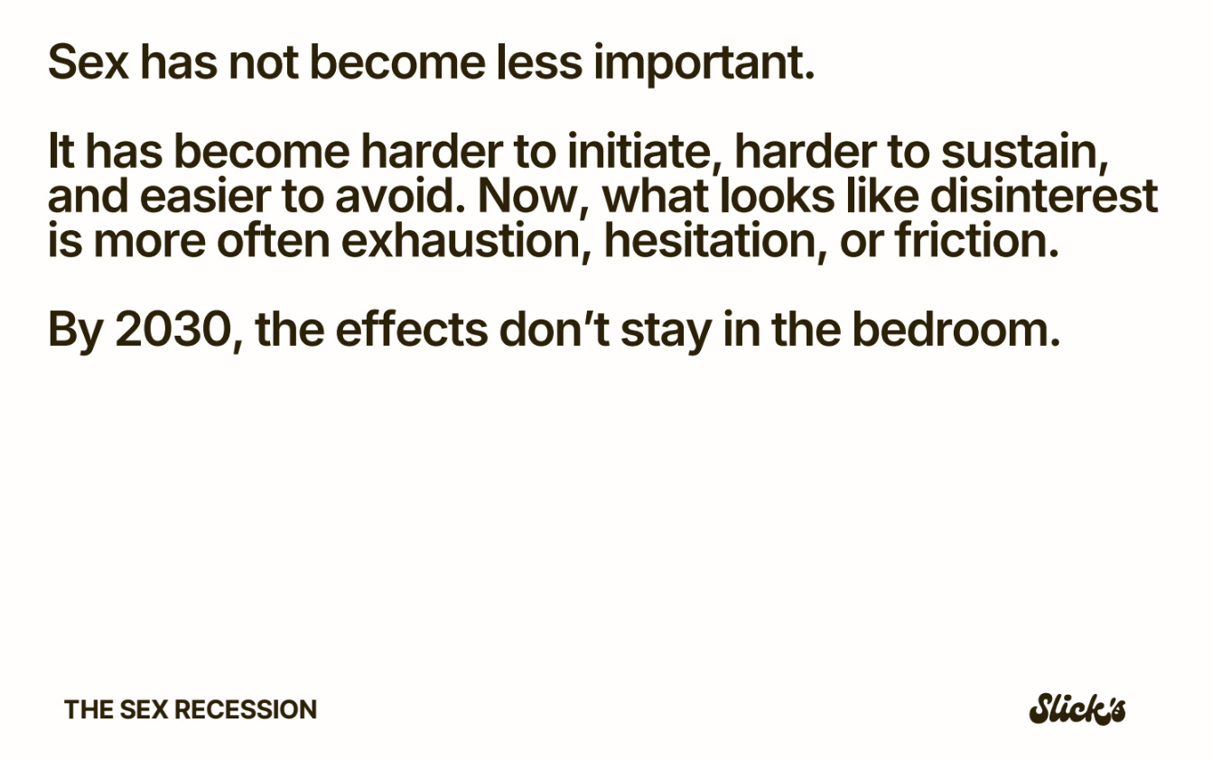 Intimacy brand Slick’s shared their recent report The Sex Recession: Intimacy and Its Decline with me, and it is a rather thoughtful compilation and analysis of the data myself and others have been citing on the problem. “Across multiple longitudinal studies, reported sexual activity has decreased steadily over the past 15–20 years,” the report reads, citing data from the General Social Survey. “This decline is most pronounced among adults under 40, with younger cohorts reporting fewer sexual encounters per year than previous generations at the same age. The trend predates the pandemic and does not rebound afterward.”