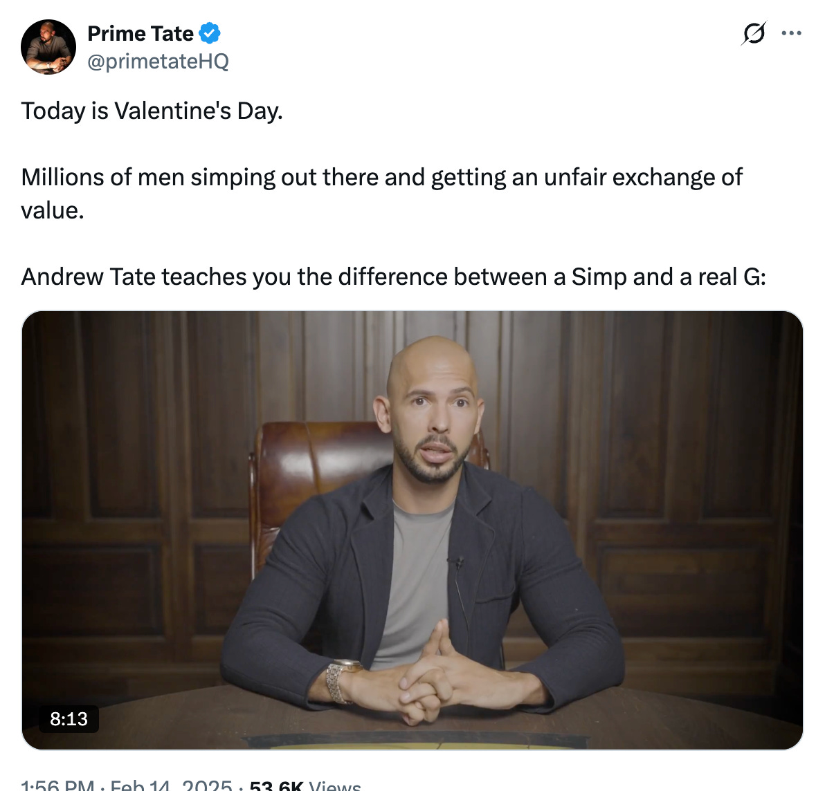 Target isn’t selling “Dump Her” t-shirts, probably because men are not the market for Valentine’s Day unless they are buying something for someone else. The concept is still nevertheless being marketed to men elsewhere, namely through guys like Andrew Tate and other members of the Manosphere.