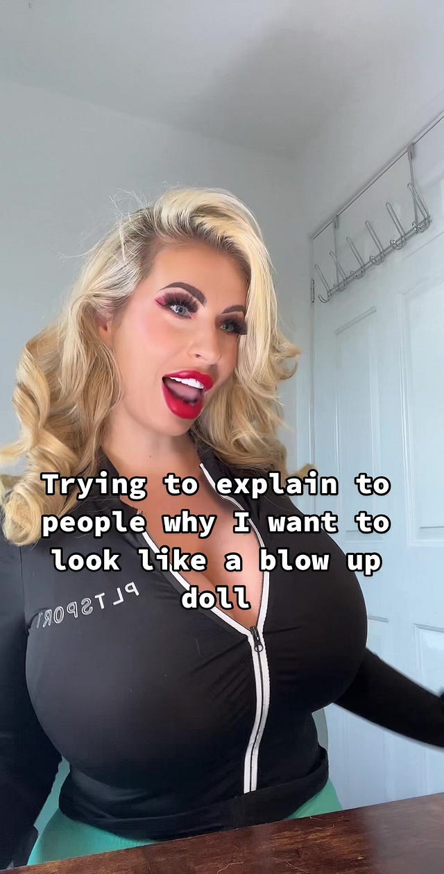 What defines someone’s own sexual pleasure, moreover, can sometimes be inextricably linked with someone else’s sexual pleasure, too. Such is often the case for the bimbo. A woman who likes to pretend she is a plastic sex doll, I must imagine, likely delights in the idea that her partner is enjoying the concept, too. And again, in the context of one’s individual, private life, there is nothing wrong with that. There might even be a beauty in collapsing oneself momentarily into the desires of another. But just the same, it doesn’t have to be wrapped in a package of feminist empowerment for the sake of public palatability. Not everything needs to be subject to this form of political scrutiny.
