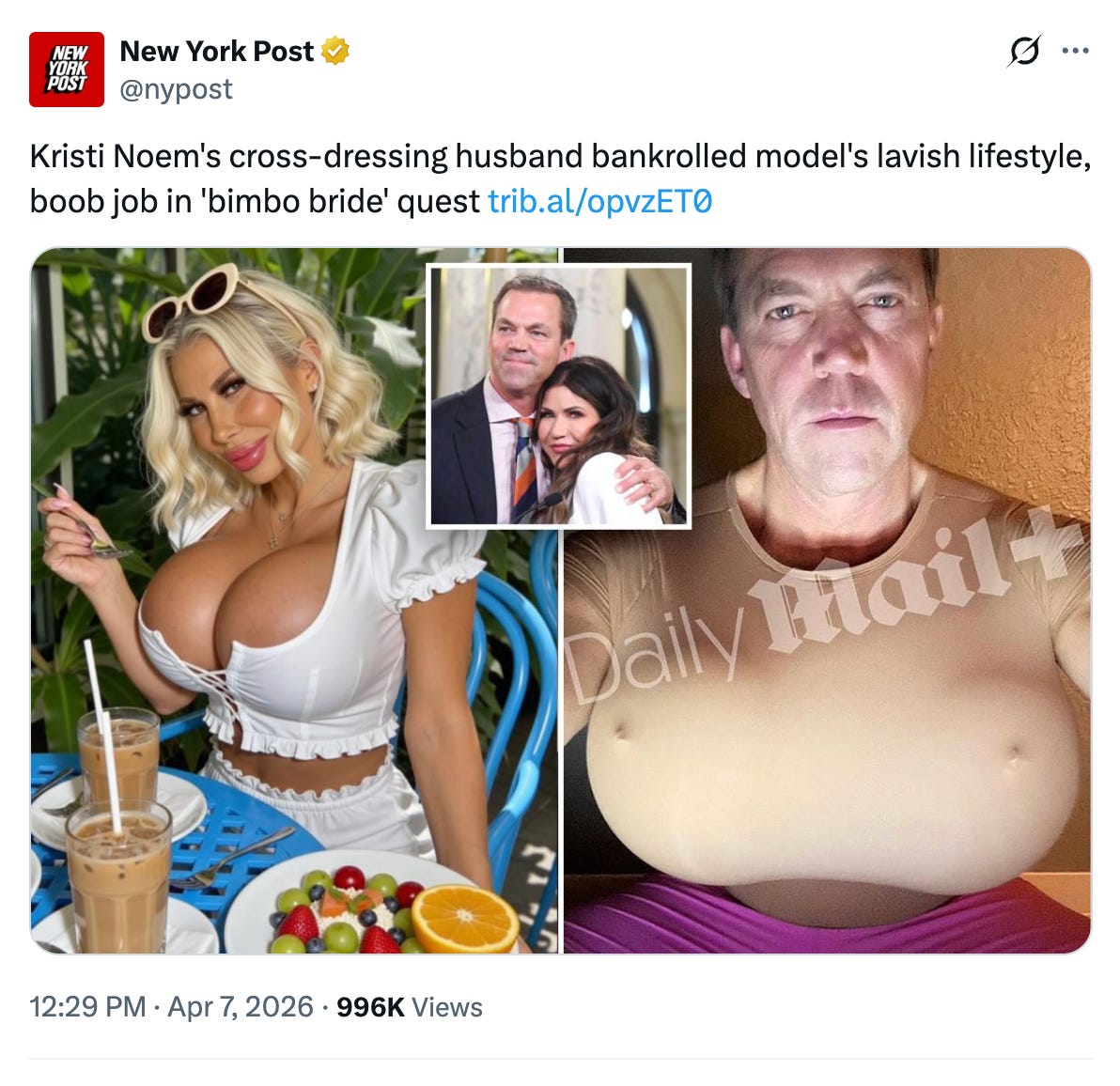 Last week, as you may have heard, former Department of Homeland Security Secretary Kristi Noem’s husband Bryon Noem was revealed to be harboring a fetish for wearing cartoonishly large prosthetic breasts and paying adult performers on the Internet to indulge him in crossdressing. Bryon enjoys the experience of “bimbofication,” a kink in which, yes, one transforms into a bimbo: giant breasts, tight clothes and the mentality of an air-headed woman who loves to be sexy and sexualized.