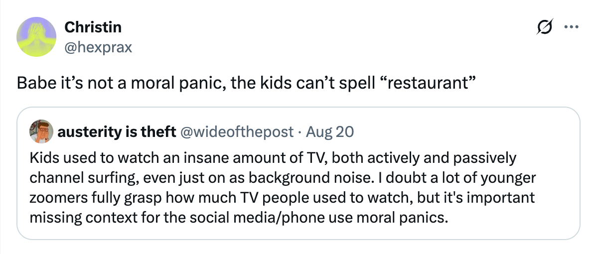 Many want to call this whole conversation around phones a moral panic, and maybe for those who do actually want some sort of federal ban on them, that label is accurate. But the term “moral panic” has itself been reduced to the point of meaninglessness — anything that someone generally doesn’t agree with or doesn’t think is as big of a deal is now subject to the label.